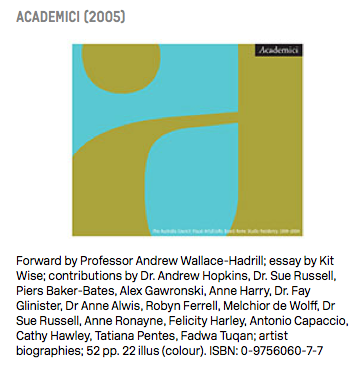 Screenshot 2014-09-07 11.24.02Catalogue Essay, ‘Geoffrey Weary’s Floating World’, ACADEMICI: Academy Gallery, British School at Rome, The Australia Council Visual Arts/Crafts Board Rome Studio Residency 1999-2004, Monash University, Australia Council for the Arts 2005 p38-39 ISBN: 0-9756060-7-7