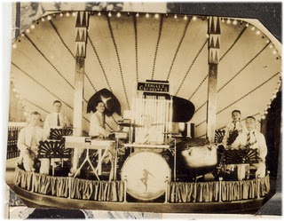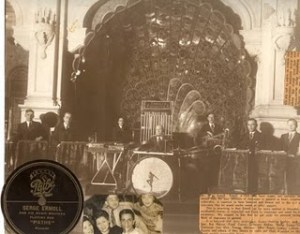 Serge Ermoll Сергей Ермолаев and His Orchestra, the Astor House 礼查饭店 Hotel Ballroom/ Bandstand with peacock fan half shell and Pathe label collage – Peacock Hall the cities first ballroom, Shanghai, China,1930.